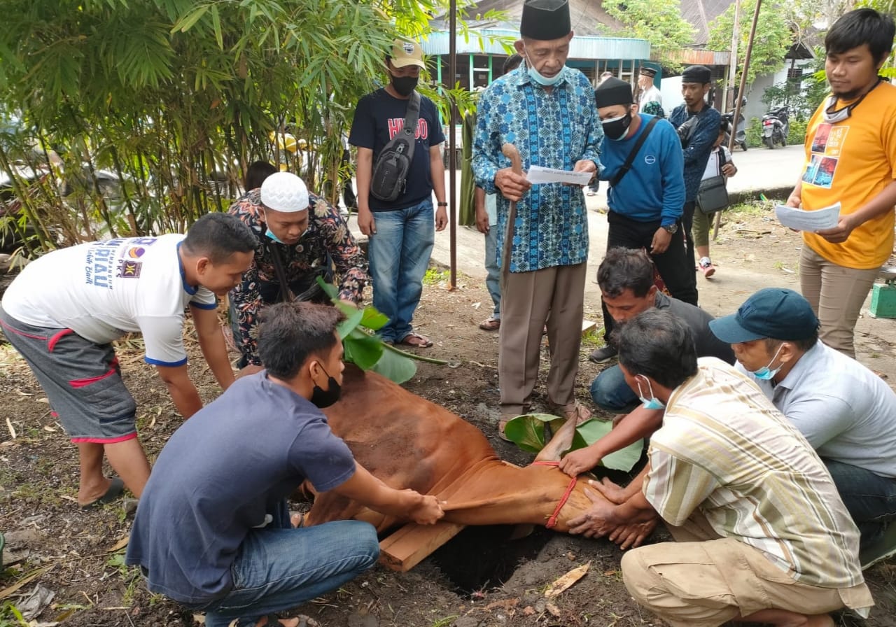 Usai doa bersama, PD IWO Inhil melaksanakan pemotongan hewan kurban dibantu warga sekitar lokasi Sekretariat PD IWO Inhil.