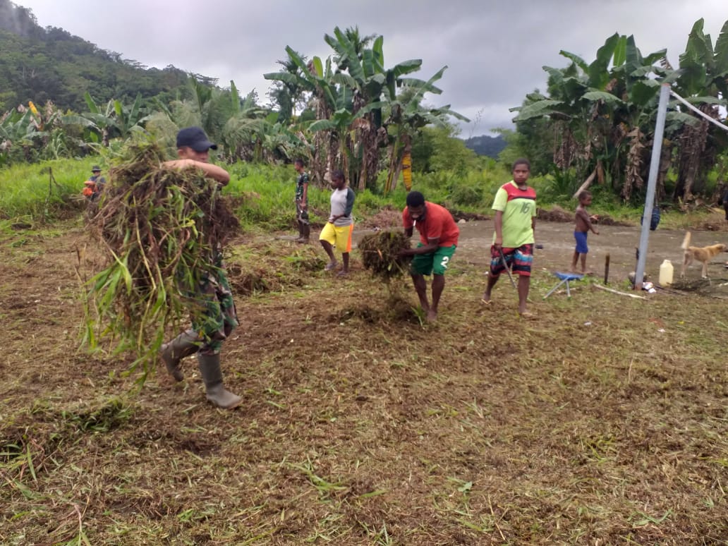SIBERONE.COM - Satgas Pamtas RI-PNG Yonif 403/WP Bersama Masyarakat Melakukan Giat Bersih Lapangan Sepak Bola di Distrik Iwur, Kabupaten Pegunungan Bintang,Senin (26/7/2021).