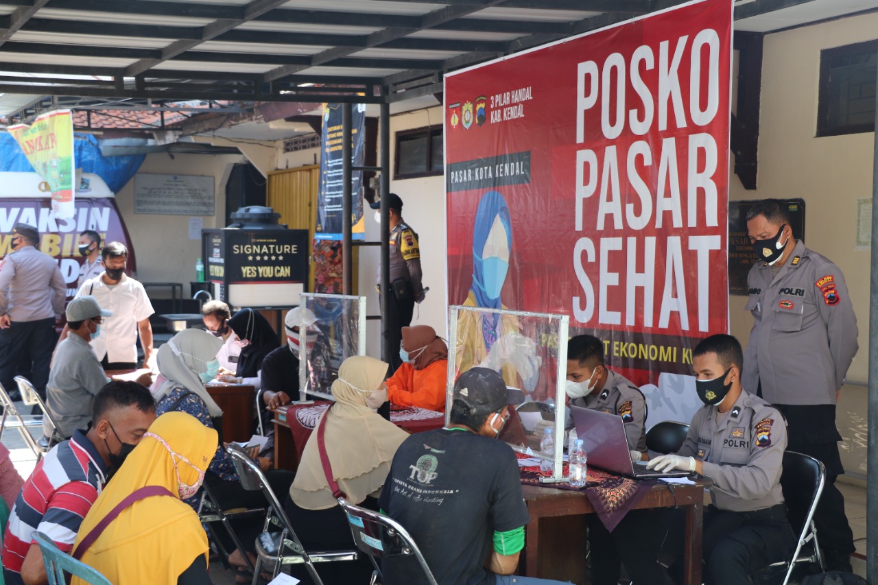 Namun kali ini vaksinasi bagi para pedagang yang dilaksanakan oleh Polres Kendal dalam Program Pasar Sehat dengan slogan “Pasar Sehat Ekonomi Kuat” yang berlangsung di Halaman Kantor Pasar Kendal dengan vaksinator dari Urkes Polres Kendal dan Bhayangkari Handal Polres Kendal, Rabu (28/7/2021).