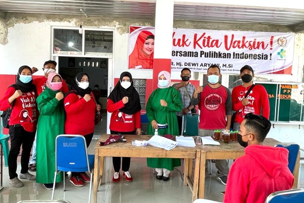 Vaksinasi massal tahap pertama, Dewi Aryani bekerjasama dengan Kementerian Kesehatan, Dinas Kesehatan Kabupaten Tegal dengan melibatkan 100 tenaga kesehatan (nakes).