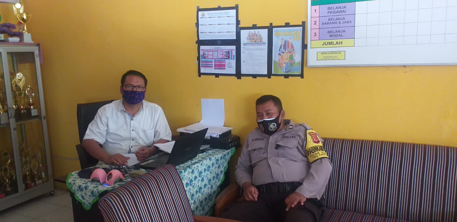 Bhabinkamtibmas Desa Dukuh Aiptu H. Carda Polsek Kapetakan Polres Cirebon Kota, silaturahmi / sambang Kamtibmas bersama Hansip ke Bpk Saripudi, SPd selaku Kepala Sekolah SDN 2 Dukuh, mensurvai kegiatan PTM.