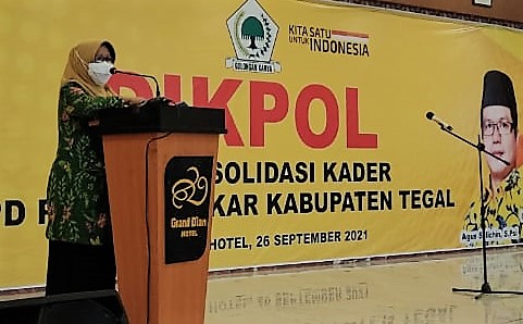 Pernyataan tersebut disampaikan Bupati Tegal Umi Azizah pada acara pelantikan dan pengukuhan Angkatan Muda Partai Golkar (AMPG) dan Kesatuan Perempuan Partai Golkar (KPPG) Kabupaten Tegal periode 2021-2026 di Syailendra Convention Hall, Hotel Grand Dian Slawi, Minggu (26/9/2021).