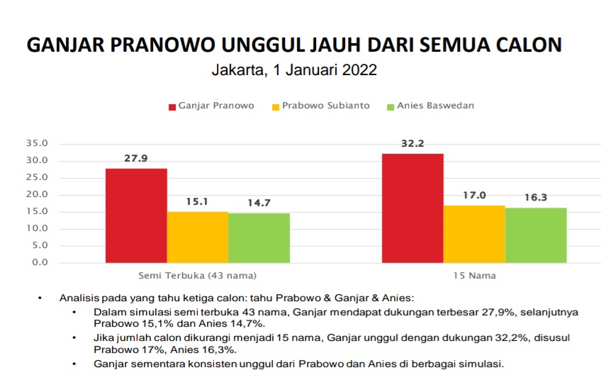 Dalam format semi terbuka, suara untuk Ganjar Pranowo sebesar 27,9 persen. Sementara dukungan pada Prabowo Subianto sebanyak 15,1 persen, dan Anies Baswedan 14,7 persen. Terlebih lagi pada simulasi 15 nama, ditemukan bahwa dukungan pada Ganjar semakin besar menjadi 32,2 persen. Sedangkan suara untuk Prabowo sebesar 17,0 persen dan Anies 16,3 persen.