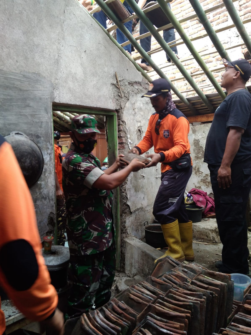 SIBERONE.COM - Bintara Pembina Desa (Babinsa) Desa Jatiwangi, Koramil 18/Pagerbarang, Kodim 0712/Tegal, Serda Asep Koswara, guyub rukun bersama warga melaksanakan gotong-royong memperbaiki rumah milik Kasmuri RT 02/01 Desa Jatiwangi Kecamatan Pagerbarang, Kabupaten Tegal, Jumat (4/2/2022).