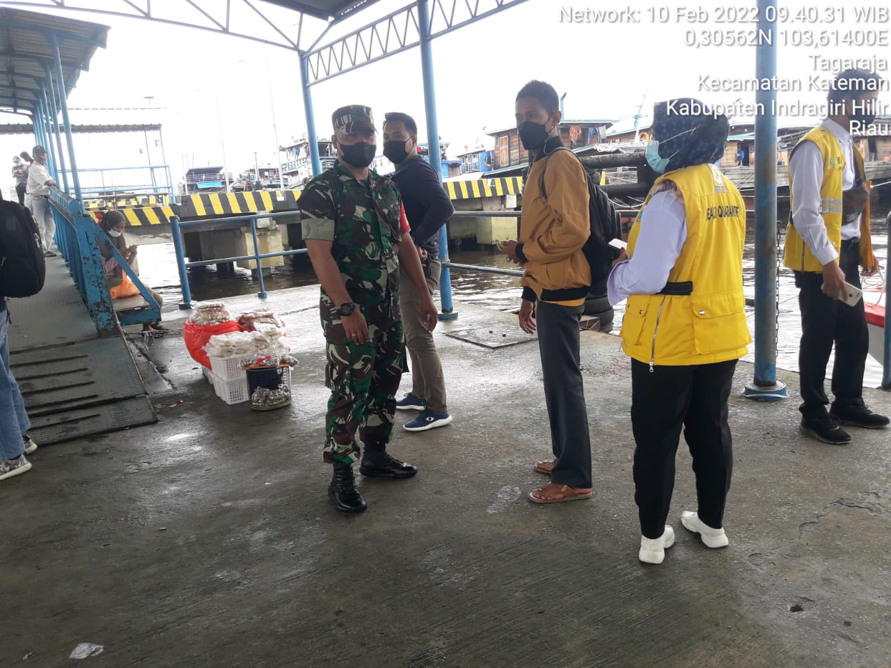 SIBERONE.COM - Bintara Pembinas Desa (Babinsa) Komando Rayon Militer (Koramil) 06/Kateman jajaran Kodim 0314/Inhil Serda Edili Zalukhu melaksanakan penegakan disiplin terpadu protokol kesehatan dalam rangka pencegahan COVID-19 di pelabuhan Syahbandar/HK Kelurahan Taga Raja, Kecamatan Kateman, kabupaten Indragiri Hilir, pada Kamis (10/2/2022) pukul 09:00 WIB.