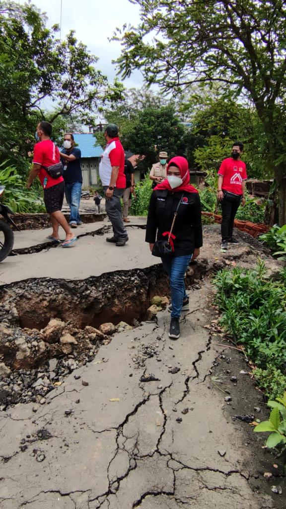 "Medannya luar biasa, kita lihat tadi, ruas-ruas jalan mulai mengalami keretakan dan kemiringan yang cukup parah. Ini sangat-sangat membahayakan warga," ungkap Dewi Aryani saat tiba di lokasi terparah.