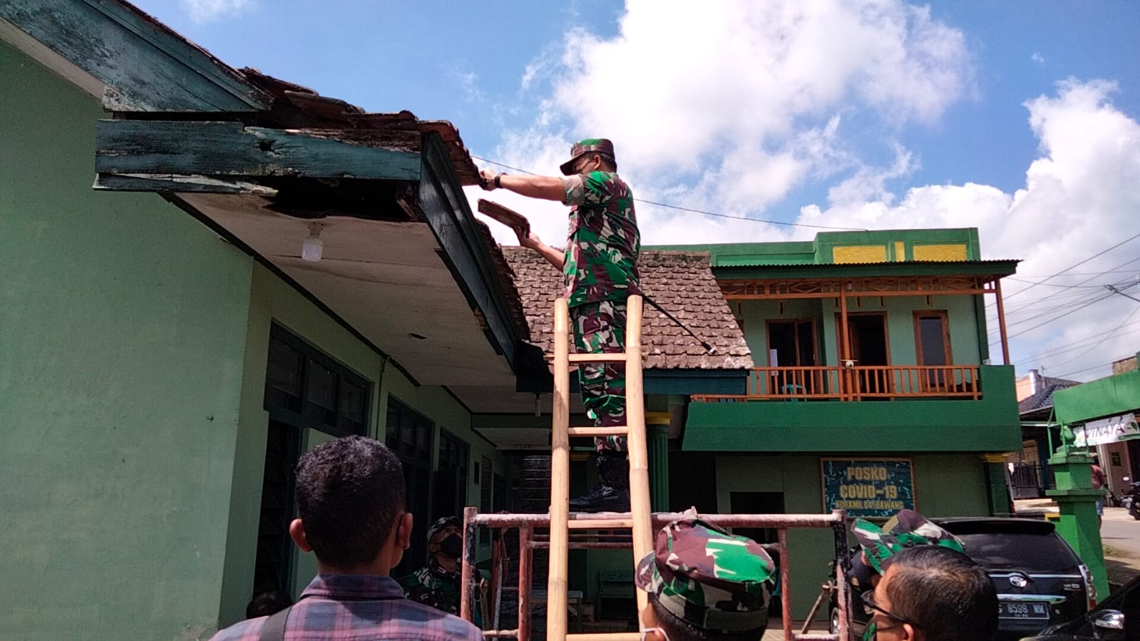 Seusai selamatan Komandan Kodim 0736/Batang Letkol Arh Yan Eka Putra menurunkan beberapa buah genteng sebagai tanda di mulainya pembongkaran dan pembangunan kantor Koramil 04/Bawang.