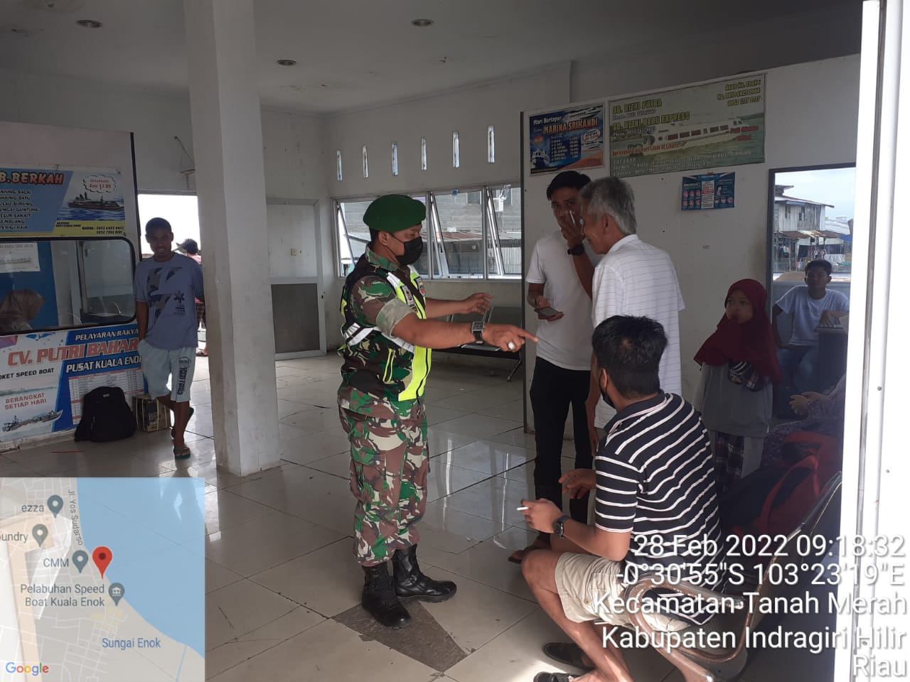 SIBERONE.COM - Bintara Pembina Desa (Babinsa) Koramil 02 Tanah Merah jajaran Kodim 0314/Inhil Sertu Payaman Siregar melaksanakan kegiatan penegakan disiplin terpadu Protokol kesehatan di tempat-tempat umum.