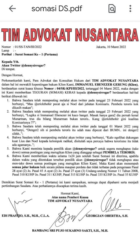 Kuasa Hukum Immanuel Ebenezer Somasi Denny Siregar Pemilik Akun Twitter @dennysirregar7