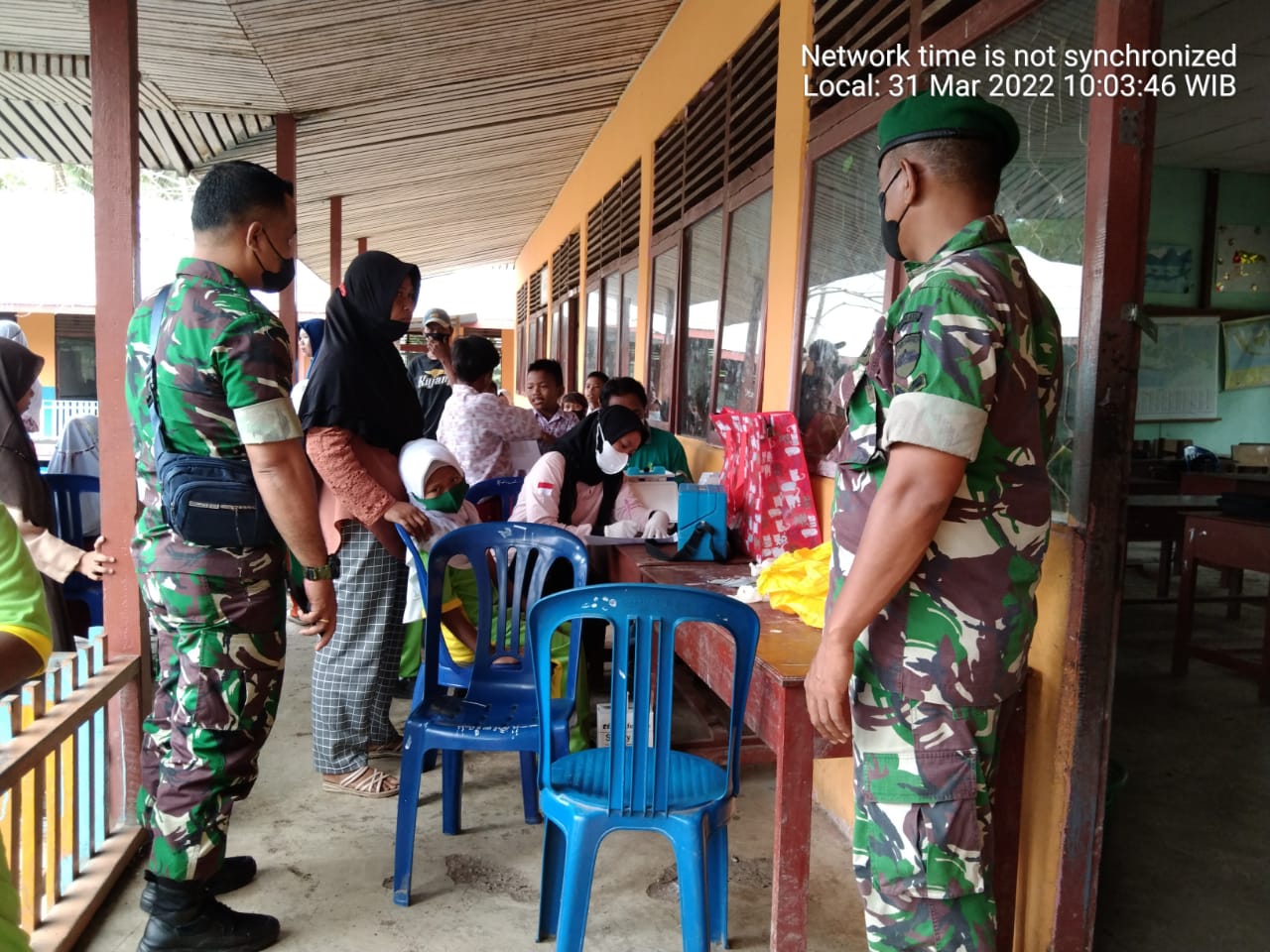 "Kita berdua memberikan pendampingan vaksinasi tersebut supaya anak-anak tidak merasa takut, sehingga kita memberikan semangat, bahwa disuntik vaksin tidak sakit," ungkap Serda Piter disela-sela pelaksanaan Vaksinasi, Kamis (31/3/2022). Sekitar pukul 08:30 wib.