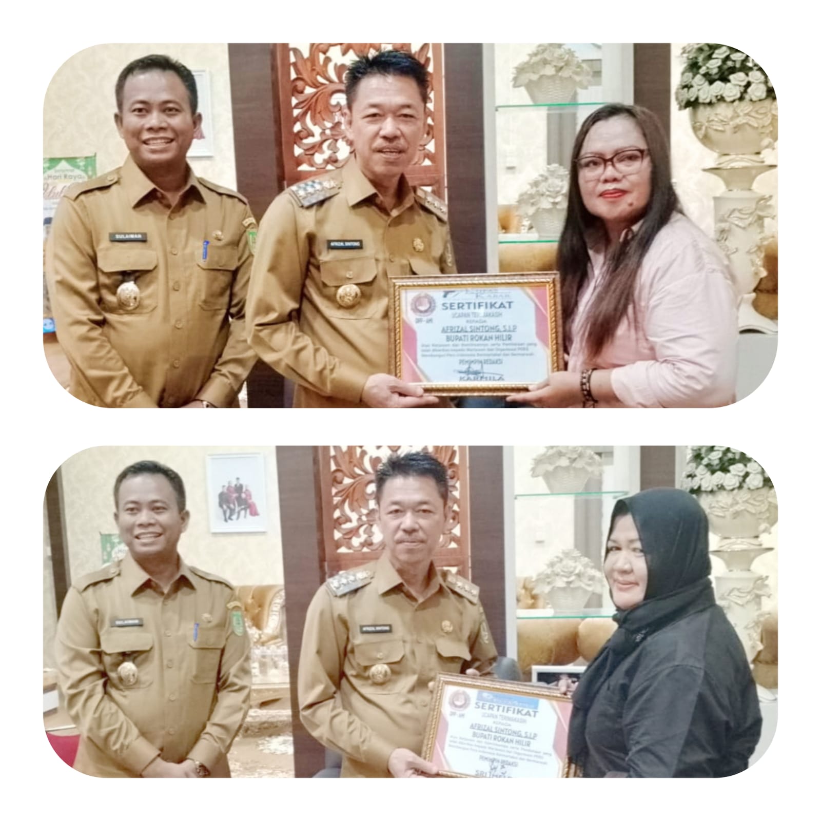 Silaturahmi ditutup dengan pemberian Sertifikat Ucapan Terimakasih yang diberikan oleh Karmila Owner (Pemilik) Media Online (Kupaskabar.Com),, Sri Imelda Owner Media Online Catatanperiatiwa.Com, kepada Afrizal Sintong Bupati, H Sulaiman Wakil Bupati dan Indra Gunawan Plt Kadiskominfo Kab. Rokan Hilir serta Photo bersama.