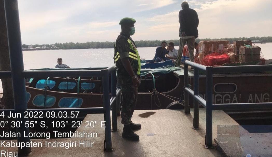 SIBERONE.COM - Pelaksanaan penegakan disiplin terpadu Protokol kesehatan upaya mencegah terjadinya penyebaran COVID-19 di tempat umum, seperti pelabuhan yang ada di kecamatan Tanah Merah terus menerus dilakukan oleh personil Babinsa Koramil 02 Tanah Merah jajaran Kodim 0314/Inhil.