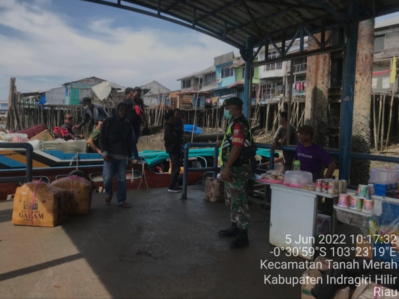 SIBERONE.COM - Anggota Koramil 02/Tanah Merah jajaran Kodim 0314/Inhil terus melaksanakan kegiatan penegakan disiplin terpadu Protokol kesehatan (Protkes) di pelabuhan yang ada di kecamatan Tanah Merah, kabupaten Indragiri Hilir (Inhil). Ahad (5/6/2022) pagi.