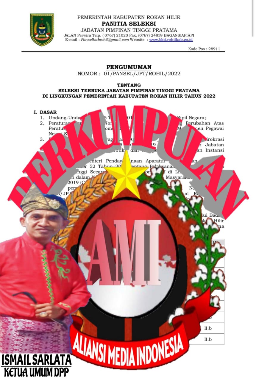 Ismail Sarlata Ketua Umum Dewan Pimpinan Pusat (DPP) Perkumpulan Aliansi Media Indonesia (AMI), dalam Pres Rilisnya yang disampaikan kepada media baik cetak maupun online, Minggu (05/06/2022). Meminta, " Badan Kepegawaian dan Pengembangan Sumber Daya manusia melalui Panitia Seleksi (Pansel), obyektif dalam pelaksanaan proses lelang 17 jabatan Kepala Dinas dilingkungan kepemerintahan Kab.Rokan Hilir yang merujuk pada Pengumuman tersebut diatas, dan pada perundang-undangan yang berlaku di Negara Republik Indonesia. "