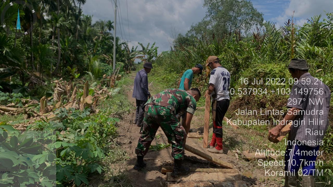 SIBERONE.COM - Babinsa Koramil 02/Tanah Merah, jajaran Kodim 0314/Inhil Serda Marhalim Pasaribu melakukan komunikasi sosial (Komsos) melalui kegiatan gotong royong dengan warga kelurahan Pusaran, kecamatan Enok, kabupaten Indragiri Hilir (Inhil) Sabtu (16/7/2022) pagi.