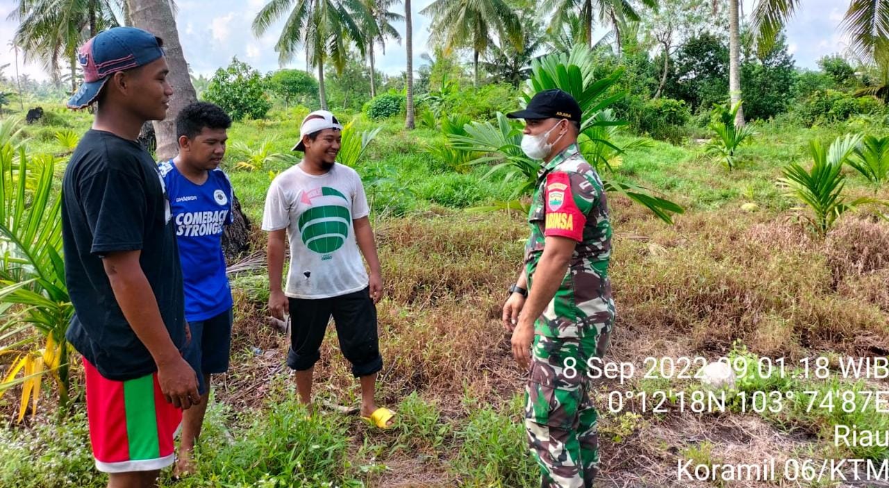 SIBERONE.COM - Bintara Pembina Desa (Babinsa) Komando Rayon Militer (Koramil) 06/Kateman, jajaran Kodim 0314/Inhil Serda Edili Z melaksanakan kegiatan patroli dan sosialisasi Karhutla di daerah rawan sering terjadi kebakaran hutan dan lahan (Karhutla) di wilayah Kecamatan Kateman, kabupaten Indragiri Hilir, Kamis (8/9/2022) pagi.