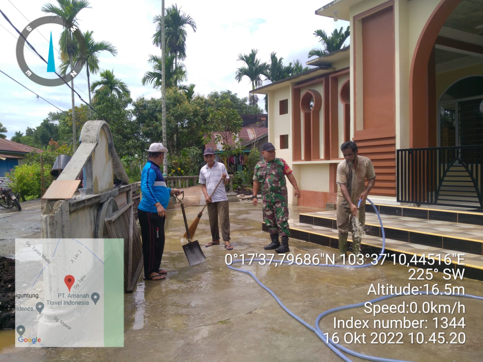 Sertu Jonni Pasaribu bersama warga Desa binaannya melaksanakan gotong royong membersihkan halaman Surau Ar-Rahma di mulai dari memotong rumput dan membuang sampah – sampah, membersihkan selokan, tempat wudhu sampai pada bagian dalam masjid.