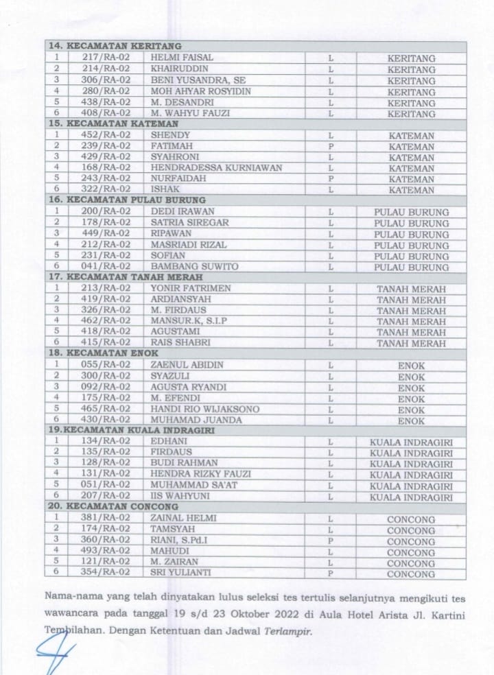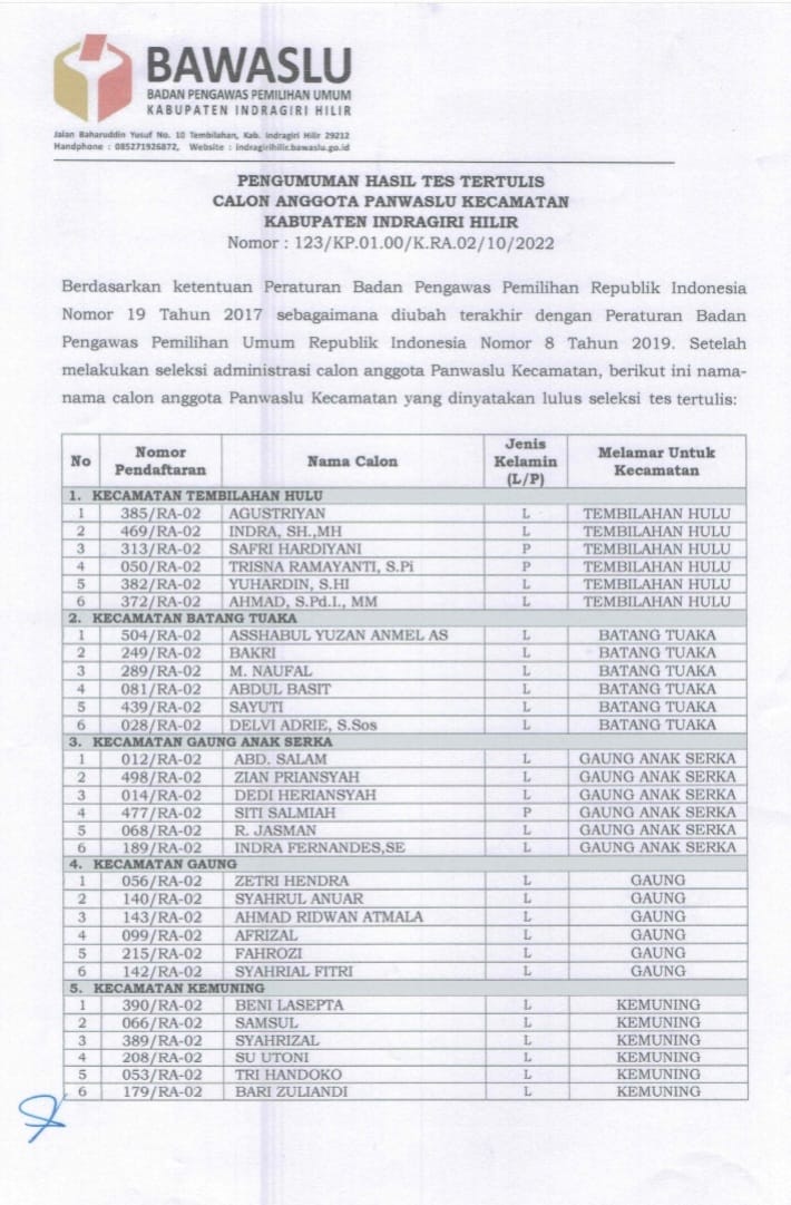Kelulusan dapat diketahui dari surat Nomor : 123/KP.01.00/K.RA-02/10/2022 yang ditanda tangani oleh Ketua Pokja Pembentukan Panwascam Kabupaten Inhil, H. Agus Malik SHI CME dan Sekretaris Nurillah SE.