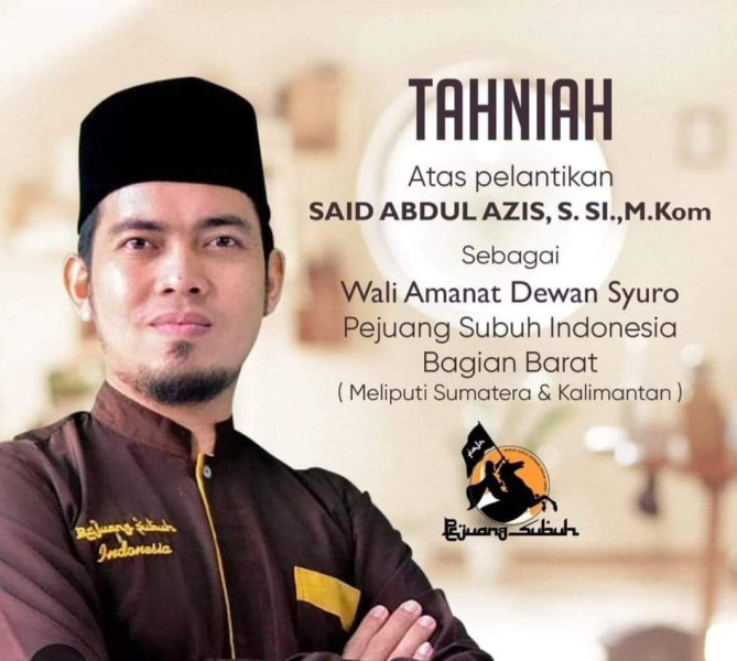 "Kita sudah musyawarahkan bersama Ketua Pejuang Subuh Indonesia dan Para Dewan syuro serta Founder Pejuang Subuh terkait Penunjukan Saudara Said Abdul Azis untuk dijadikan sebagai Wali Amanat dengan pertimbangan pertimbangan tertentu diantaranya beliau mampu membawa Pejuang Subuh Tembilahan sebagi Chapter Terbaik se-Indonesia," ucap Kang Riko sapaan akrab dewan Syura pejuang Subuh Indonesia.