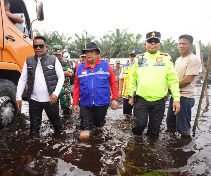 Tampak orang nomor satu di Bumi Lancang Kuning bersama Bupati Pelalawan Zukri Misran turun dan melihat langsung lokasi banjir yang kedalaman airnya sepaha orang dewasa.