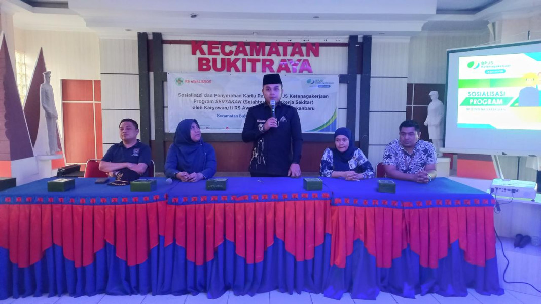 SIBERONE.COM - Upaya memperluas cakupan kepesertaan dari pekerja informal, BPJS Ketenagakerjaan (BPJAMSOSTEK) Kantor Cabang Pekanbaru bersama RS Awal Bros Sudirman menggelar Sosialisasi Program Jamsostek sekaligus Launching Program Sejahterakan Pekerja Sekitar Anda (SERTAKAN). Acara yang dipusatkan di Kantor Camat Bukit Raya itu dihadiri perwakilan pimpinan RS Awal Bros Sudirman, dr Linda dan Camat Bukit Raya, Tengku Ardi Dwisasti.