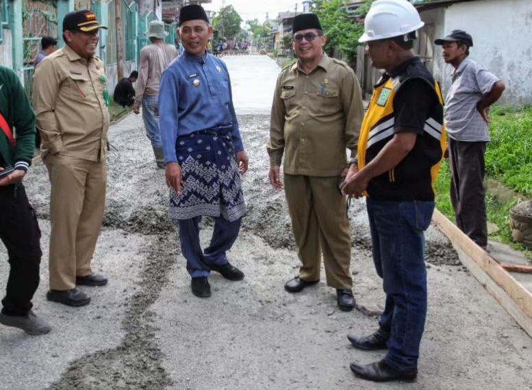 Saat Pj.Bupati datang didampingi Kadis Kesbangpol dan Plt. Camat Tembilahan Hulu tampak beberapa pekerja dan Kabid Bina Marga Dinas PUPR sedang mengontrol pekerjaan.
