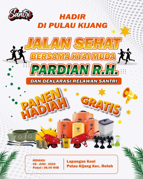SIBERONE.COM - Minggu, 9 Juni 2024 akan berlangsung Jalan Sehat bersama Kyai Muda Pardian Rivai Hidayatullah dan Deklarasi Relawan Santri yang akan diselenggarakan di Lapangan Koni, Pulau Kijang, Kecamatan Reteh.