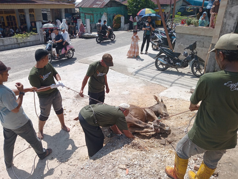 SIBERONE.COM - Sebagai wujud rasa syukur atas rezeki yang telah diberikan Allah SWT, jamaah Masjid Nurul Ikhsan menyembelih 12 ekor hewan kurban pada Hari Raya Idul Adha 1445 H. Penyembelihan hewan kurban berlangsung di halaman masjid di Jalan Irkab, RT 002/RW 005, Kelurahan Sidomulyo Timur, Marpoyan Damai, Senin (17/6/2024).