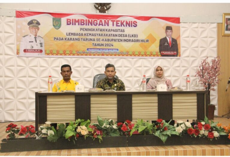 Bimbingan Teknis (Bimtek) Peningkatan Kapasitas Lembaga Masyarakat (LKD) pada Karang Taruna Se-kabupaten Indragiri Hilir Tahun 2024 dibuka oleh Penjabat (Pj) Bupati Inhil Yang ditandai dengan pengalungan tanda peserta secara simbolis.