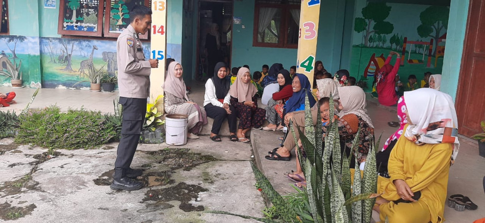 Kapolsek Tembilahan Hulu, AKP Ricki Marzuki, SH diwakili oleh Bhabinkamtibmas Desa Pulau Palas, Kecamatan Tembilahan Hulu, Bripka Nurfajri Sadriades berdiskusi dengan ibu-ibu yang sedang menunggu anaknya pulang sekolah, di TK Pembina Jalan Pendidikan Desa Pulau Palas Kecamatan Tembilahan Hulu.
