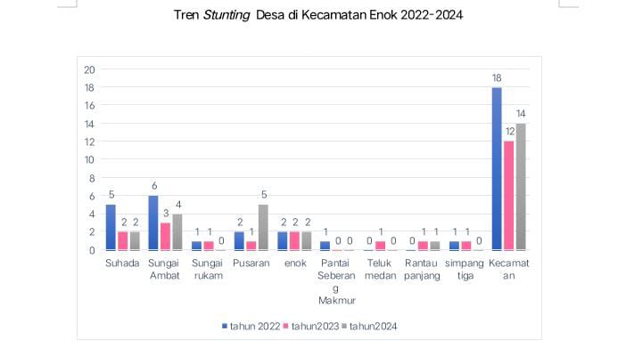 SIBERONE.COM - Kecamatan Enok mengalami tren penurunan signifikan dalam kasus stunting di sebagian besar desa dari tahun 2022 hingga 2024.