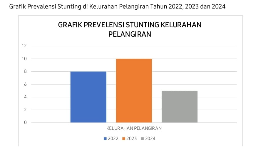 Berdasarkan data terbaru, prevalensi stunting di Kelurahan Pelangiran menunjukkan perkembangan positif. Jumlah kasus stunting meningkat dari 8 kasus pada tahun 2022 menjadi 10 kasus pada tahun 2023, namun berhasil turun menjadi 5 kasus pada tahun 2024. Meskipun ada penurunan, pemerintah mengingatkan bahwa upaya untuk mengatasi stunting harus lebih komprehensif dan berkelanjutan.