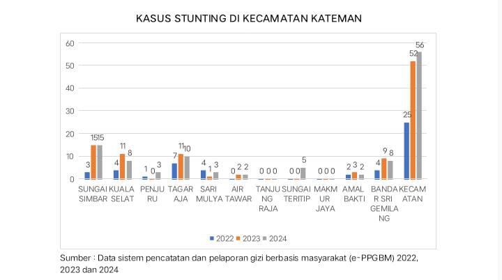 SIBERONE.COM — Prevalensi stunting di Kecamatan Kateman terus mengalami peningkatan dari tahun ke tahun, dengan data terbaru menunjukkan bahwa jumlah kasus stunting meningkat dari 25 kasus pada tahun 2022 menjadi 52 kasus pada tahun 2023, dan mencapai 56 kasus pada tahun 2024. Stunting, kondisi gagal tumbuh pada anak akibat kekurangan gizi kronis, dapat mempengaruhi pertumbuhan fisik dan perkembangan otak anak.