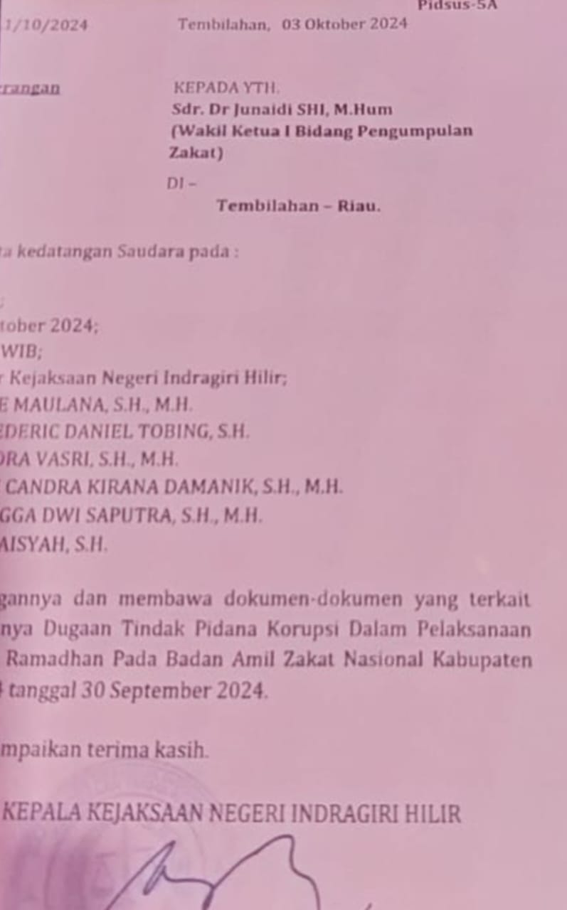 Surat yang keluar pada tanggal 03 Oktober 2024 itu tidak terfoto secara penuh namun media meyakini bahwa surat ini resmi dikeluarkan oleh pihak Kejari Inhil.