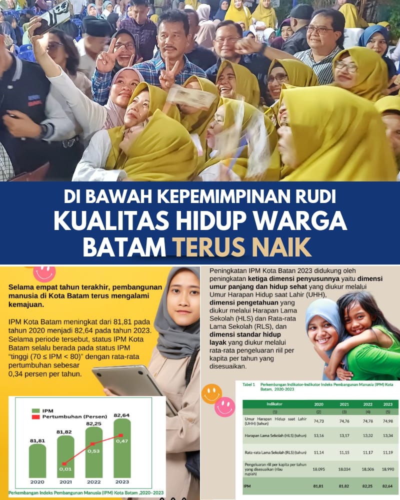 Hal itu tercermin dalam survei Badan Pusat Statistik (BPS) Kota Batam yang merilis naiknya Indeks Pembangunan Manusia (IPM) Batam di tahun 2023, yakni 82,64 poin.