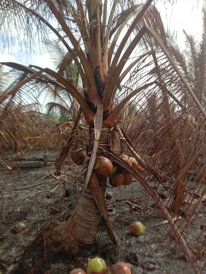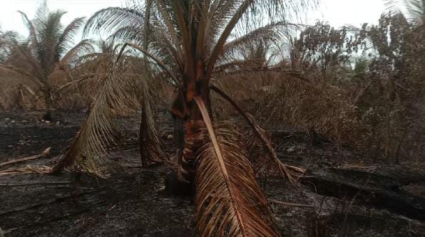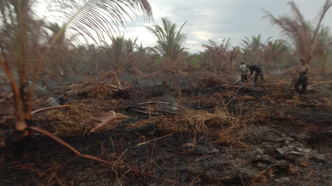 Api yang bermula muncul dari lahan kosong menjalar besar hingga menyelimuti lahan kebun sawit dan kebun kelapa milik warga yang sudah siap panen.