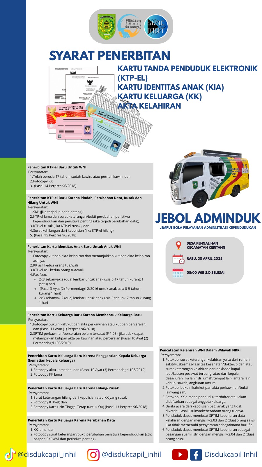 SIBERONE.COM - Dinas Kependudukan dan Pencatatan Sipil (Disdukcapil) Kabupaten Indragiri Hilir akan kembali melaksanakan program Jebol Adminduk (Jemput Bola Pelayanan Administrasi Kependudukan) untuk mempermudah masyarakat dalam mengurus dokumen kependudukan, pada Rabu, 30 April 2025, di Desa Pengalihan, Kecamatan Keritang, mulai pukul 08.00 WIB hingga selesai.