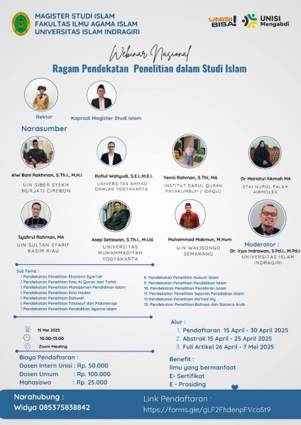 SIBERONE.COM – Program Pascasarjana Magister Studi Islam Universitas Islam Indragiri (UNISI) sukses menyelenggarakan webinar nasional bertajuk "Ragam Pendekatan Penelitian dalam Studi Islam" pada Kamis (15 Mei 2025).