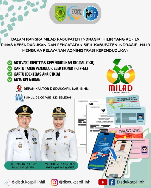 SIBERONE.COM – Dalam rangka memperingati Milad Kabupaten Indragiri Hilir yang ke-60, Dinas Kependudukan dan Pencatatan Sipil (Disdukpencapil) Kabupaten Inhil membuka pelayanan administrasi kependudukan bagi masyarakat, di depan kantor Disdukpencapi Inhil pada Ahad, 1 Juni 2025, mulai pukul 08.00 WIB hingga selesai.