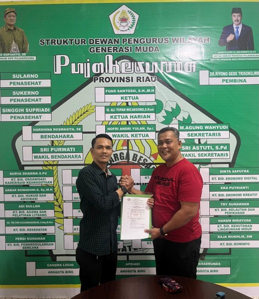 Penandatanganan SK dilakukan langsung oleh Ketua DPW Generasi Muda Pujakesuma Riau, Fuad Santoso, S.H., M.Si, bersama Sekretaris DPW, H. Agung Wahyudi. Acara serah terima dokumen resmi berlangsung di Sekretariat DPW yang berlokasi di Jalan Bambu Kuning, Kota Pekanbaru, dihadiri oleh sejumlah pengurus dan anggota senior organisasi.