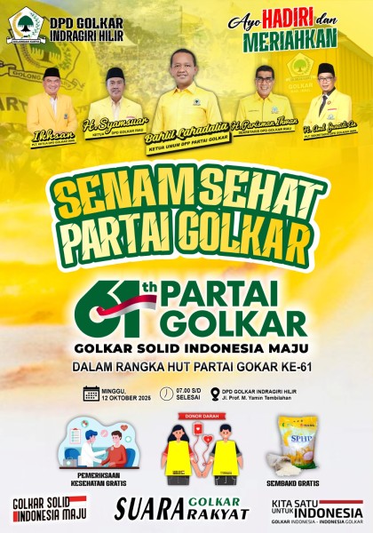 Puncak acara HUT ke-61 Partai Golkar akan digelar di halaman Kantor DPD Golkar Kabupaten Indragiri Hilir pada 12 Oktober 2025. Acara ini akan menjadi simbol kebersamaan dan dedikasi Partai Golkar kepada masyarakat Indragiri Hilir serta cermin dari semangat pengabdian yang tidak pernah padam. Untuk informasi Acara akan dihadiri.langsung oleh Ketua DPD Golkar Riau dan Wakil Ketua DPRD provinsi Riau.