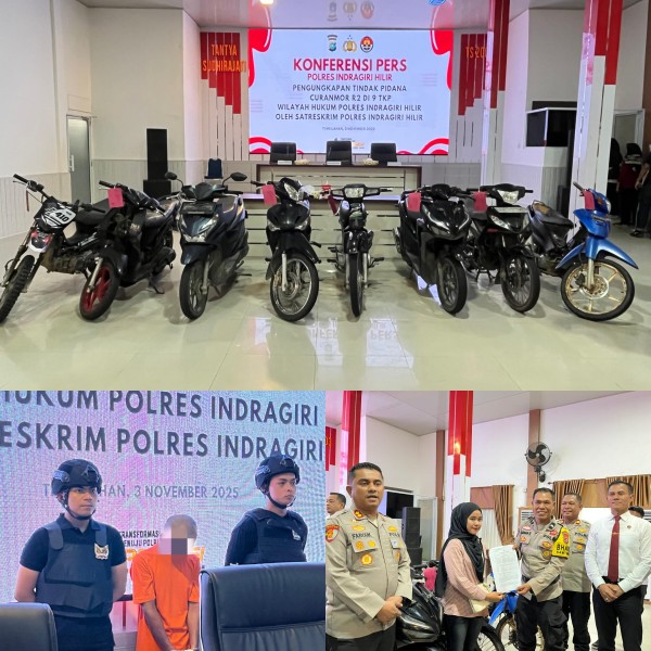 Dalam konferensi pers di Aula Rekonfu Mapolres Inhil, Senin (3/11/2025), Kapolres Inhil AKBP Farouk Oktora menampilkan sembilan unit sepeda motor hasil curian yang berhasil diamankan jajaran Satreskrim Polres Inhil.