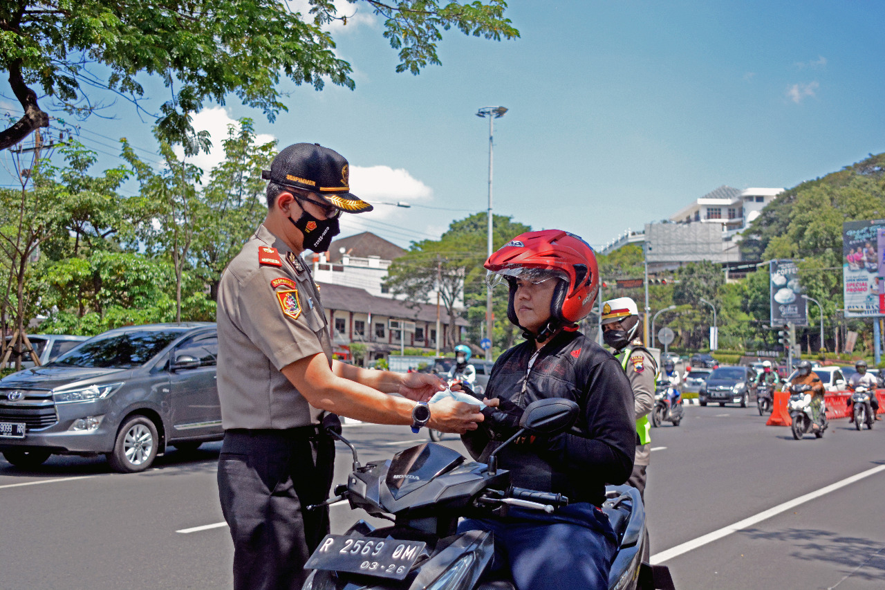SIBERONE.COM - Dalam rangka Operasi keselamatan lalu lintas candi (OKLC) 2021, Kasubdit Gakkum Ditlantas Polda Jateng bersama Serdik Sespimmen Polri Dikreg ke- 61, Serdik Heru Budiharto, SIK, MIK, Senin (19/4/21), membagikan masker kepada pengguna jalan serta warga sekitar jalan Raya Semarang Gerobogan.