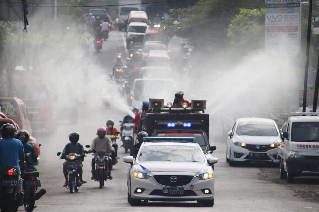 “Pagi hari ini kembali kita laksanakan kegiatan penyemprotan disinfektan pada sejumlah fasilitas umum dan jalan-jalan. Hal ini merupakan salah satu upaya pencegahan sekaligus pengendalian kasus covid-19 di Kabupaten Pekalongan,’’ujar Kapolres Pekalongan AKBP Darno.
