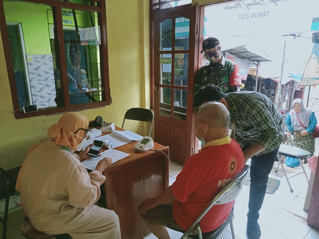 Babinsa Sertu Purwanto melaksanakan pendampingan sekaligus monitoring serta turut membantu jalannya vaksinasi jenis Sinovac pada dosis pertama.