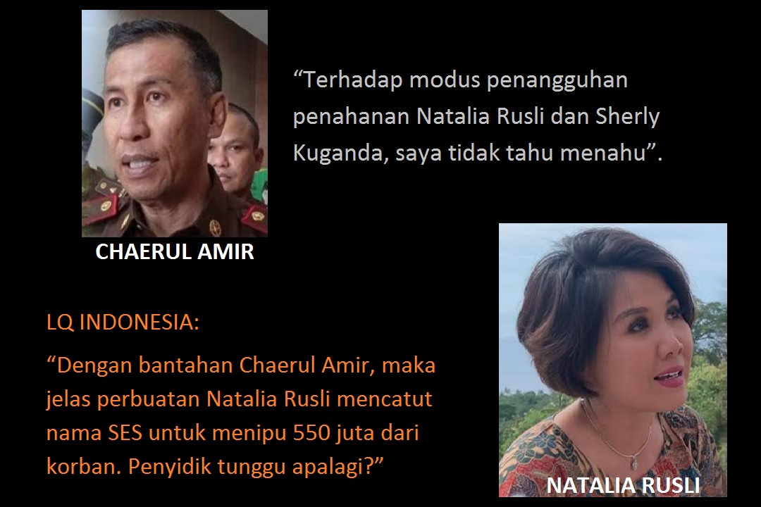 “Natalia Rusli mencatut nama Chaerul Amir untuk menipu uang 550 juta dari korban SK, dalam modus penangguhan penahanan sebagaimana tertera dalam screenshoot wa terlampir. Natalia Rusli bilang bahwa SES akan ke Surabaya mengurus dan akan mengembalikan uang yang diterima Natalia Rusli dari Sherly Kuganda dalam screen wa tanggal 11 Januari 2021. Kenyataannya WA Natalia Rusli bohong besar," katanya.