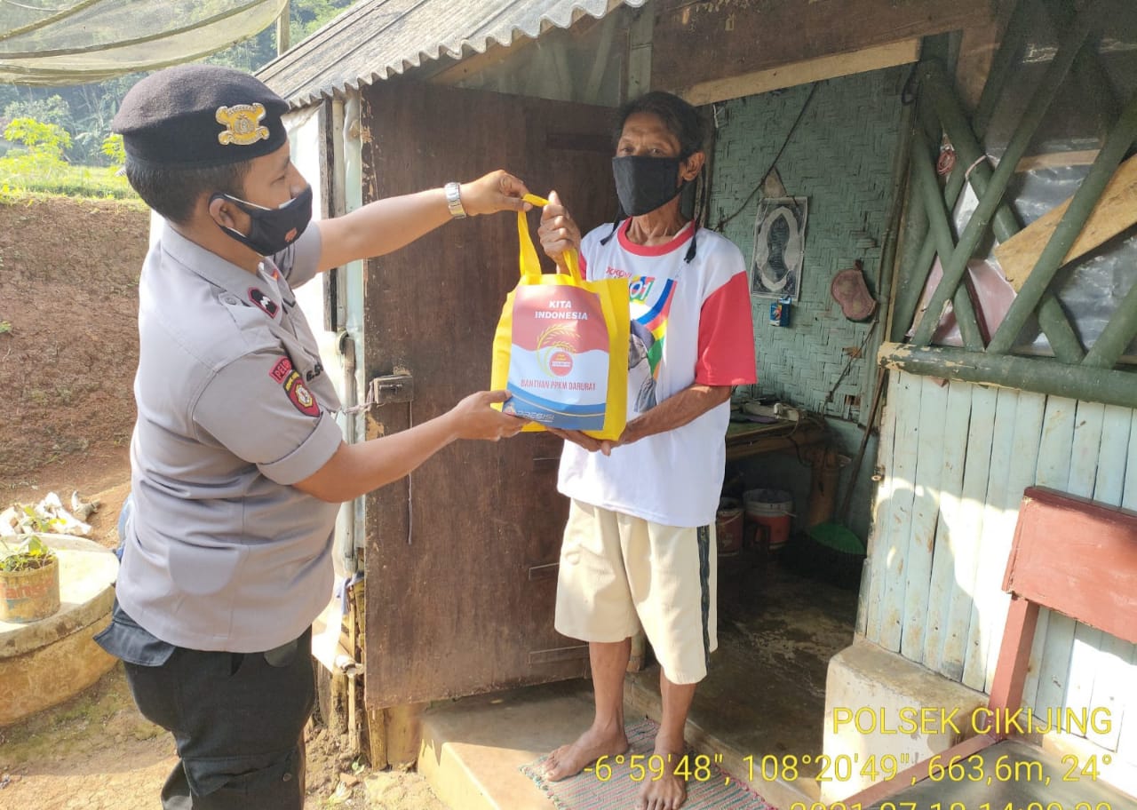 Polsek Cikijing Kembali Salurkan Paket Sembako kepada Warga Dimasa PPKM Darurat