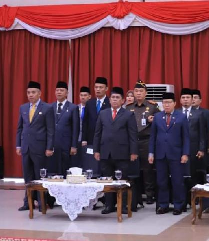 Ketua DPRD Pekanbaru Muhammad Sabarudi ST (baris kedua/tengah) saat menghadiri pengambilan sumpah dan menerima SK Pj Wali Kota Pekanbaru Muflihun, di Gedung Daerah Riau, Selasa (23/5/2023).