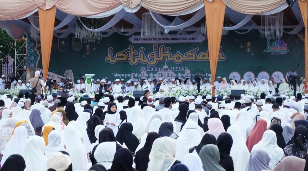 SIBERONE.COM - Istighosah Event Wisata Religi Gema Muharram 1446 yang ditaja oleh Dinas Pariwisata Pemuda dan Olahraga dan Kebudayaan Kabupaten Indragiri Hilir di lapangan upacara Gajah Mada Tembilahan, Selasa (16/7/2024). Kegiatan yang masuk dalam calendar of event Pariwista Riau ini mengusung tema "Menyongsong Tahun Baru Islam 1446 H Dengan Menumbuhkan Rasa Empati Dan Kepedulian Sosial Di Bumi Sri Gemilang"
