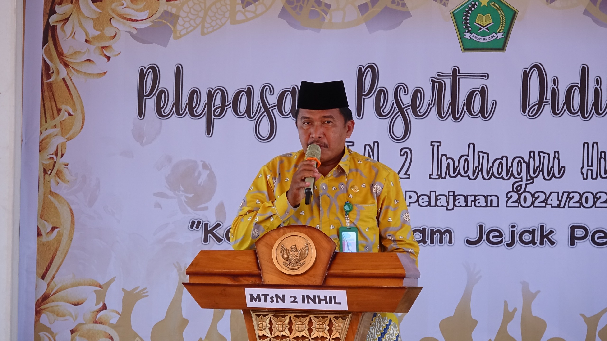 Kepala MTsN 2 Indragiri Hilir dalam sambutannya menyampaikan rasa bangga dan haru atas pencapaian para siswa.